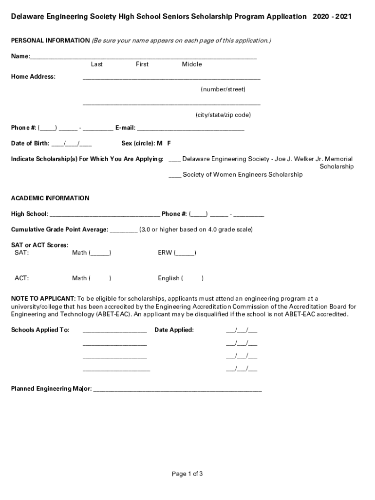 Delaware Engineering Society High School Seniors Scholarship Program Application 2020 2021 PERSONAL INFORMATION (Be sure your name appears on each page of this application.) Name:___ Last First Middle