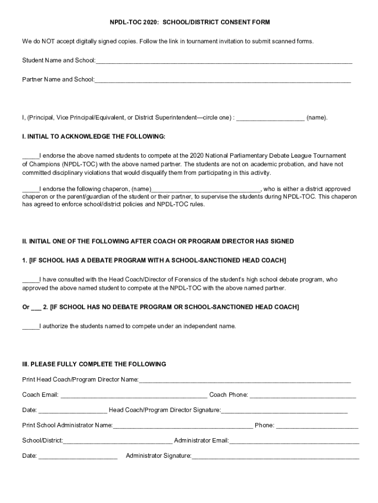 NPDLTOC 2020: SCHOOL/DISTRICT CONSENT FORM We do NOT accept digitally signed copies. Follow the link in tournament invitation to submit scanned forms. Student Name and School:___ Partner Name and