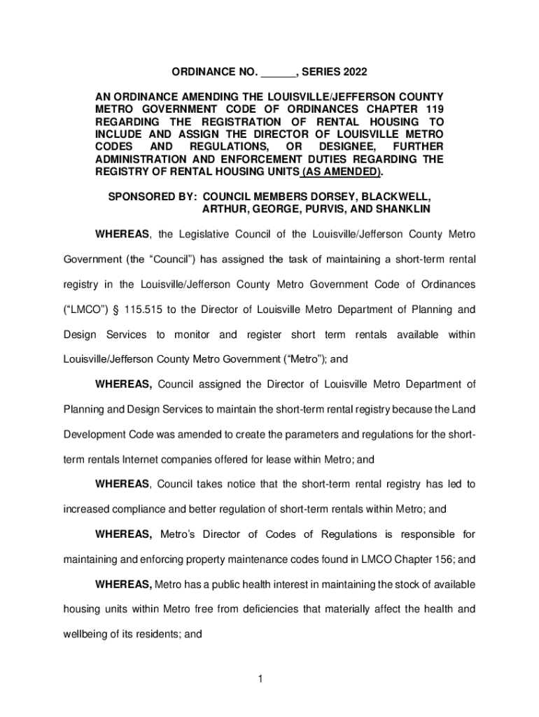 ORDINANCE NO. ___, SERIES 2022.TITLE AN ORDINANCE AMENDING THE LOUISVILLE/JEFFERSON COUNTY METRO GOVERNMENT CODE OF ORDINANCES CHAPTER 119 REGARDING THE REGISTRATION OF RENTAL HOUSING TO INCLUDE AND