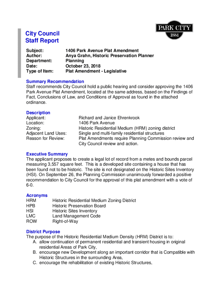 City Council Staff Report Subject: Author: Department: Date: Type of Item:1406 Park Avenue Plat Amendment Anya Grain, Historic Preservation Planner Planning October 23, 2018, Plat Amendment LegislativeSummary
