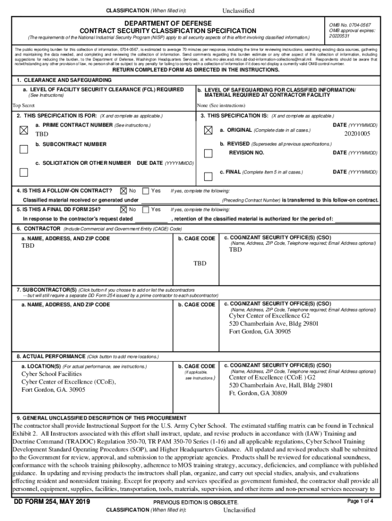 UnclassifiedCLASSIFICATION (When filled in):DEPARTMENT OF DEFENSE CONTRACT SECURITY CLASSIFICATION SPECIFICATION (The requirements of the National Industrial Security Program (ISP) apply to all security