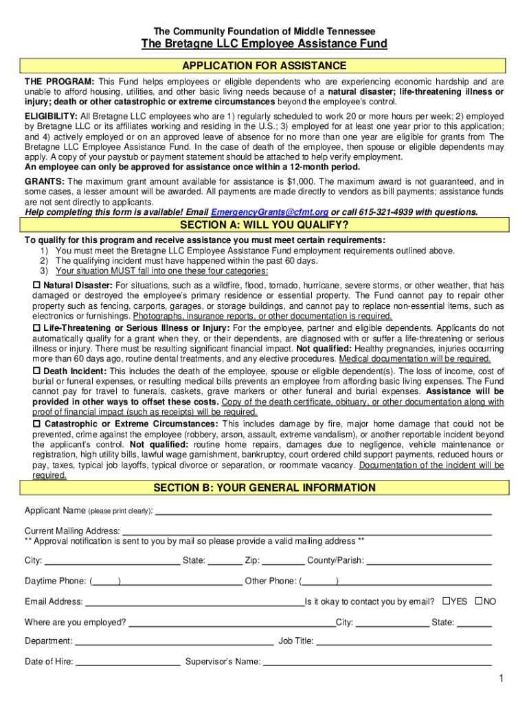 The Community Foundation of Middle Tennessee Breanne LLC Employee Assistance Fund APPLICATION FOR ASSISTANCE THE PROGRAM: This Fund helps employees or eligible dependents who are experiencing economic
