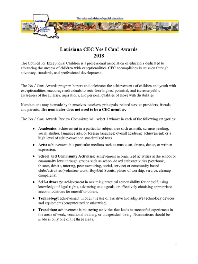 Louisiana CEC Yes I Can! Awards 2018 The Council for Exceptional Children is a professional association of educators dedicated to advancing the success of children with exceptionalities. CEC accomplishes
