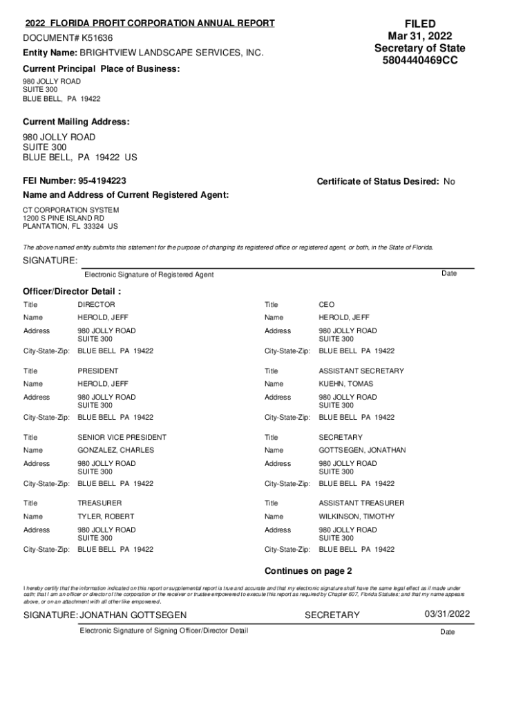 2022 FLORIDA PROFIT CORPORATION ANNUAL REPORTED Mar 31, 2022 Secretary of State 5804440469CCDOCUMENT# K51636 Entity Name: FlightView LANDSCAPE SERVICES, INC. Current Principal Place of Business: 980