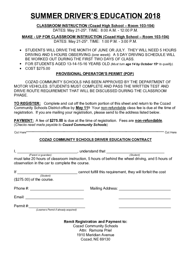 SUMMER DRIVERS EDUCATION 2018 CLASSROOM INSTRUCTION (Could Highly School Room 103104) DATES: May 2125th. TIME: 8:00 A.M. 12:00 P.M. MAKE UP FOR CLASSROOM INSTRUCTION (Could Highly School Room 103104)