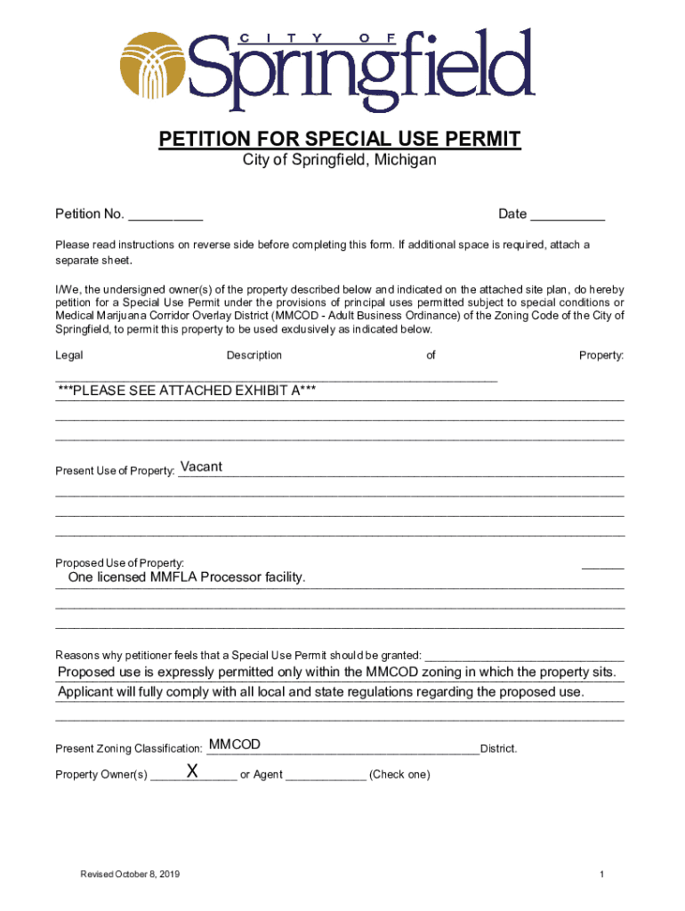PETITION FOR SPECIAL USE PERMIT City of Springfield, Michigan Petition No. ___Date ___Please read instructions on reverse side before completing this form. If additional space is required, attach