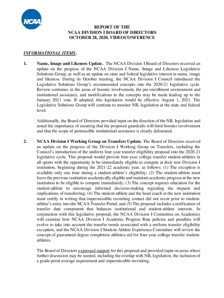 REPORT OF THE NCAA DIVISION I BOARD OF DIRECTORS OCTOBER 28, 2020, VIDEOCONFERENCEINFORMATIONAL ITEMS. 1. Name, Image and Likeness Update. The NCAA Division I Board of Directors received an update