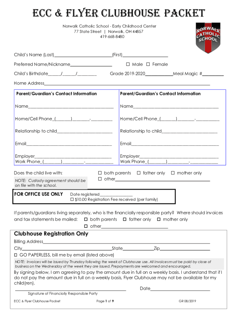 ECC & FlyEr Clubhouse Packet Norwalk Catholic School Early Childhood Center 77 State Street | Norwalk, OH 44857 4196688480Childs Name (Last)(First)Preferred Name/Nickname Male FemaleChilds Birthdate___/___/___Grade