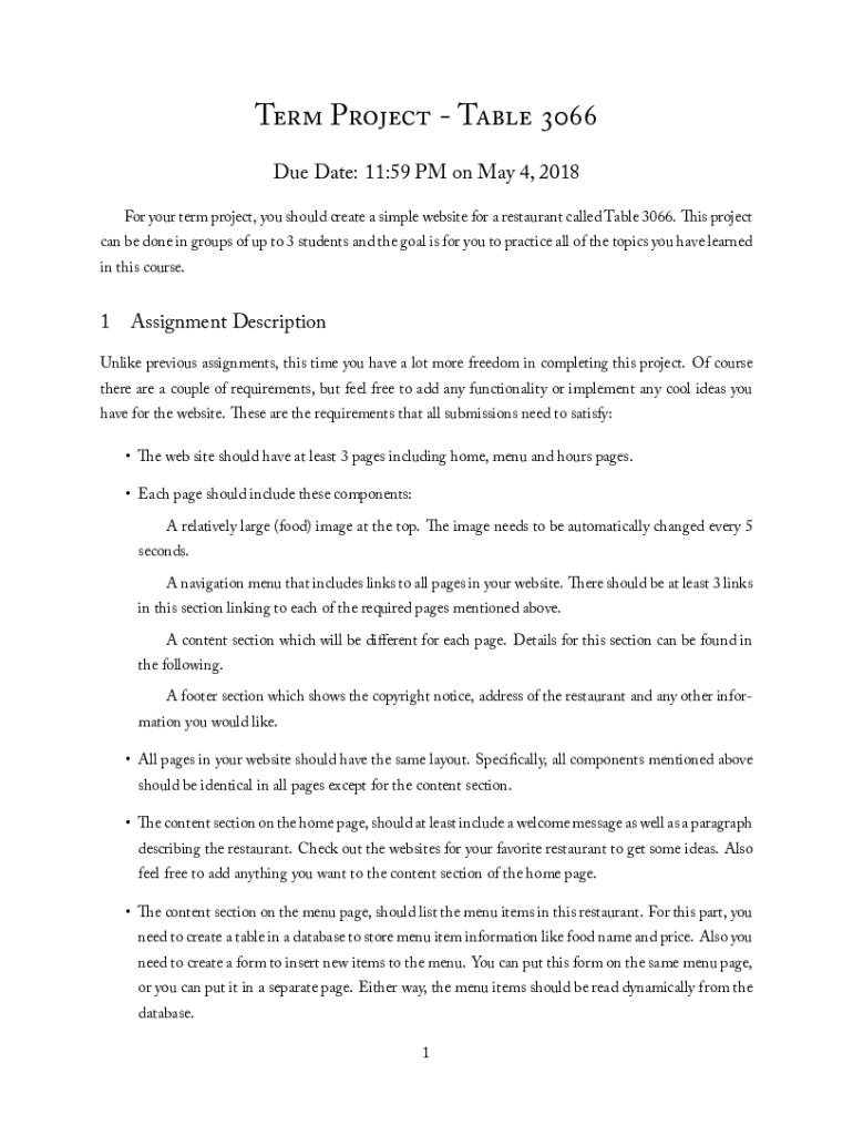 Term Project Table Due Date: 11:59 PM on May 4, 2018, For your term project, you should create a simple website for a restaurant called Table 3066. Is project can be done in groups of up to 3 students