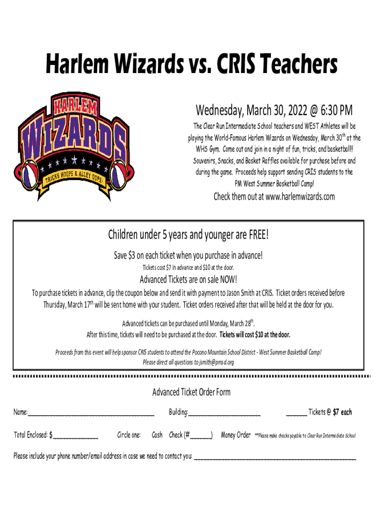Harlem Wizards vs. CHRIS Teachers Wednesday, March 30, 2022 @ 6:30 PM The Clear Run Intermediate School teachers and WEST Athletes will be playing the WorldFamous Harlem Wizards on Wednesday, March