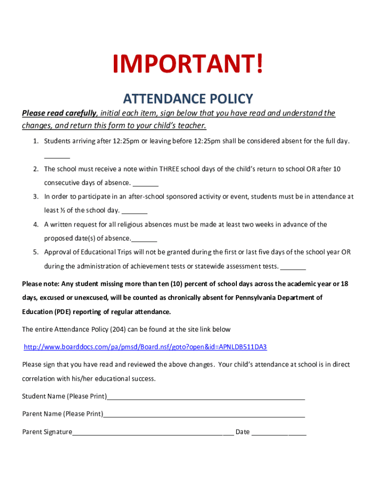 IMPORTANT! ATTENDANCE POLICY Please read carefully, initial each item, sign below that you have read and understand the changes, and return this form to your children teacher. 1. Students arriving