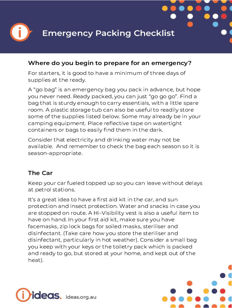 Get the free Emergency Packing Checklist - IDEAS Disability Information