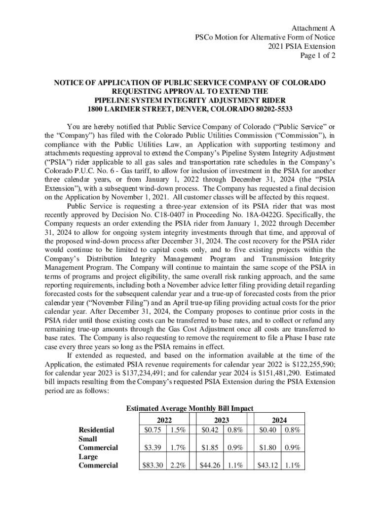 Attachment A PSO Motion for Alternative Form of Notice 2021 ASIA Extension Page 1 of 2NOTICE OF APPLICATION OF PUBLIC SERVICE COMPANY OF COLORADO REQUESTING APPROVAL TO EXTEND THE PIPELINE SYSTEM