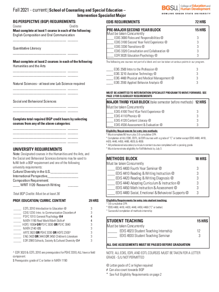 Fall 2021 current | School of Counseling and Special Education Intervention Specialist Major BG PERSPECTIVE (BGP) REQUIREMENTS:CourseCredits Must complete at least 1 course in each of the following: