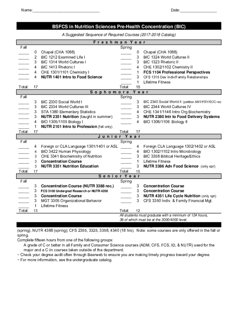 Name:___Date:___BS FCS in Nutrition Sciences Preheat Concentration (BIC) A Suggested Sequence of Required Courses (20172018 Catalog) Fall ___ ___ ___ ___ ___ ___0 2 3 4 4 4Total:17Fall ___ ___ ___