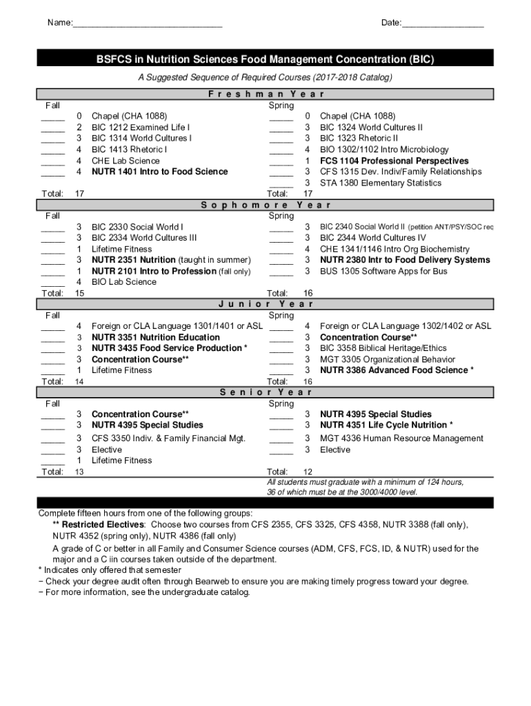 Name:___Date:___BS FCS in Nutrition Sciences Food Management Concentration (BIC) A Suggested Sequence of Required Courses (20172018 Catalog) Fall ___ ___ ___ ___ ___ ___0 2 3 4 4 4Total:17Fall ___