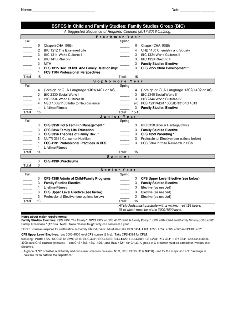 Name:___Date:___BS FCS in Child and Family Studies: Family Studies Group (BIC) A Suggested Sequence of Required Courses (20172018 Catalog) Fall ___ ___ ___ ___ ___ ___ ___ Total: Fall r e s h m an