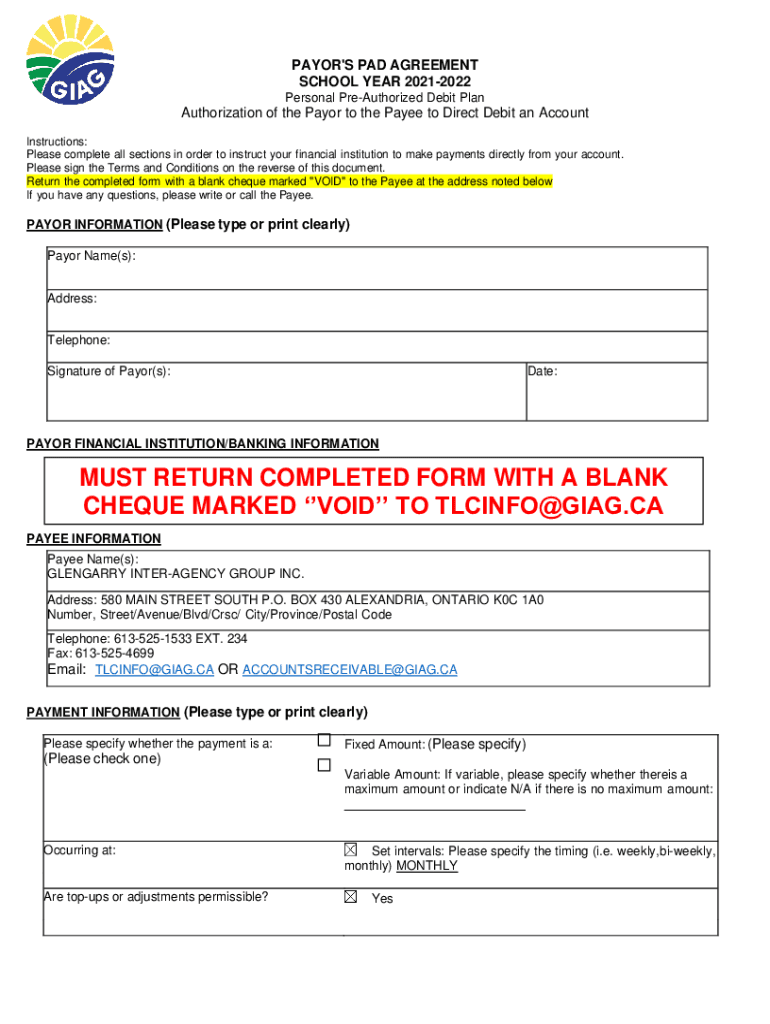 MAYOR\'S PAD AGREEMENT SCHOOL YEAR 20212022 Personal PreAuthorized Debit Pre-authorization of the Mayor to the Payee to Direct Debit an Account instruction: Please complete all sections in order to