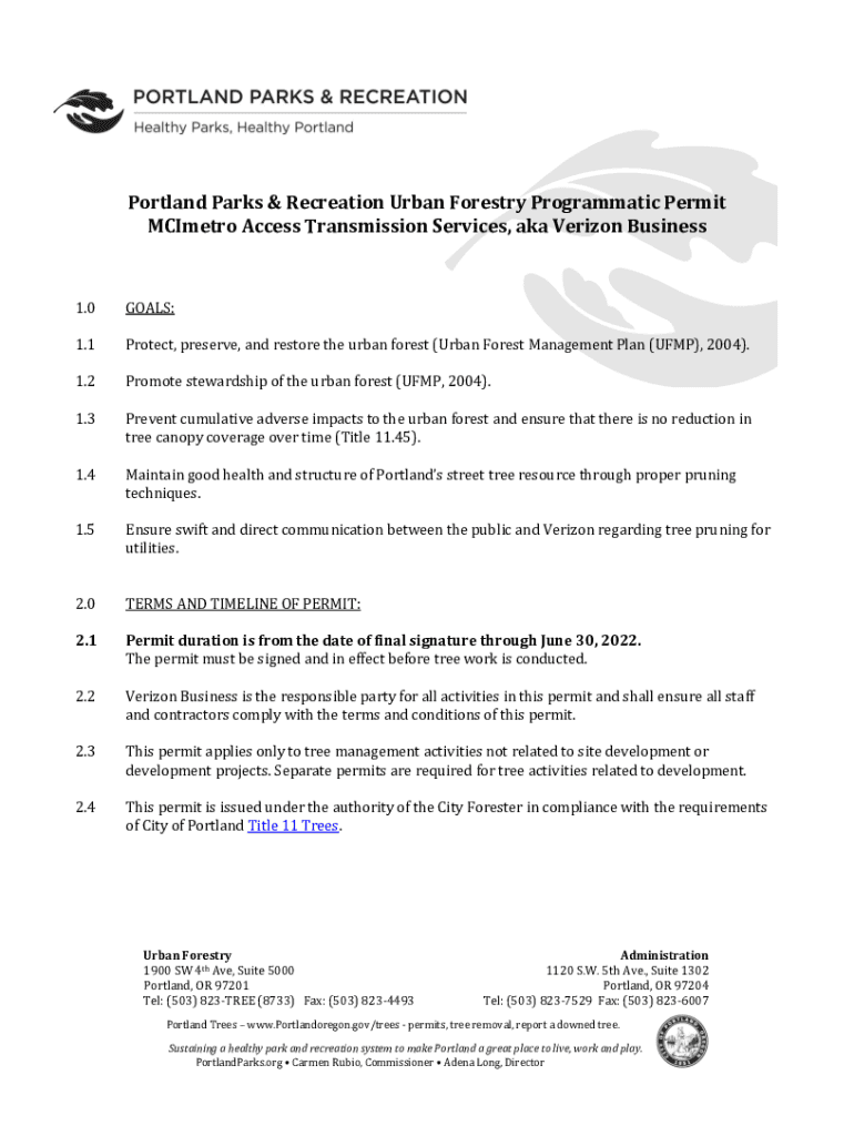 Portland Parks & Recreation Urban Forestry Programmatic Permit MCI metro Access Transmission Services, aka Verizon Business1.0GOALS:1.1Protect, preserve, and restore the urban forest (Urban Forest