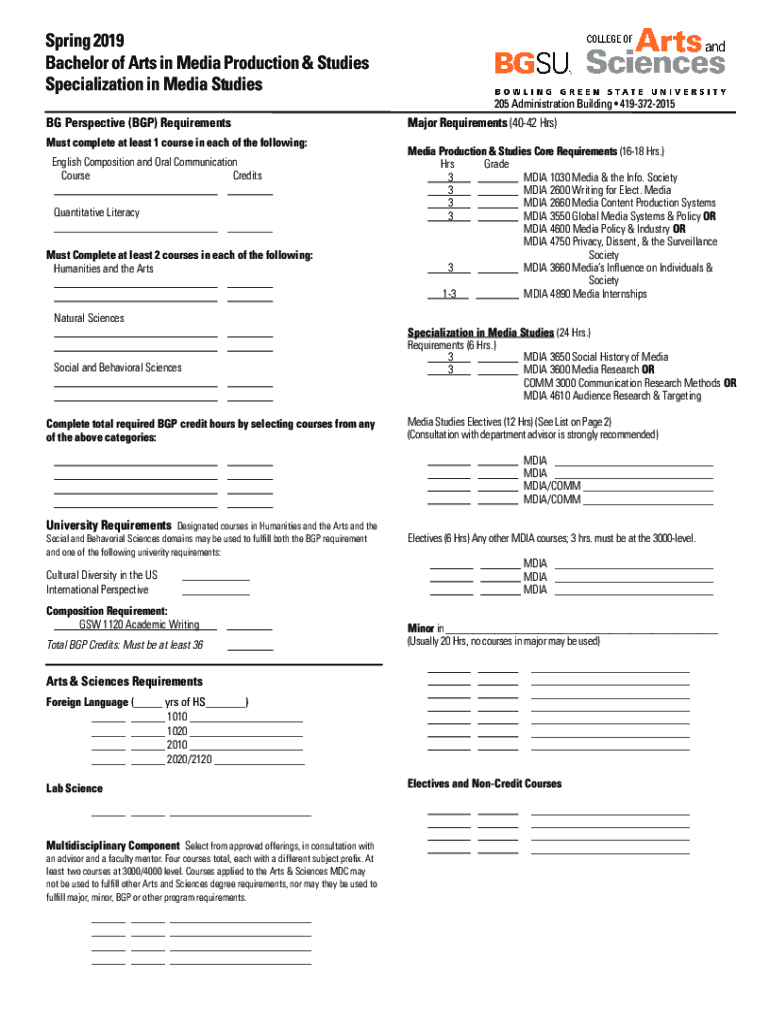 Spring 2019 Bachelor of Arts in Media Production & Studies Specialization in Media Studies 205 Administration Building 4193722015BG Perspective (BGP) Requirements Must complete at least 1 course in
