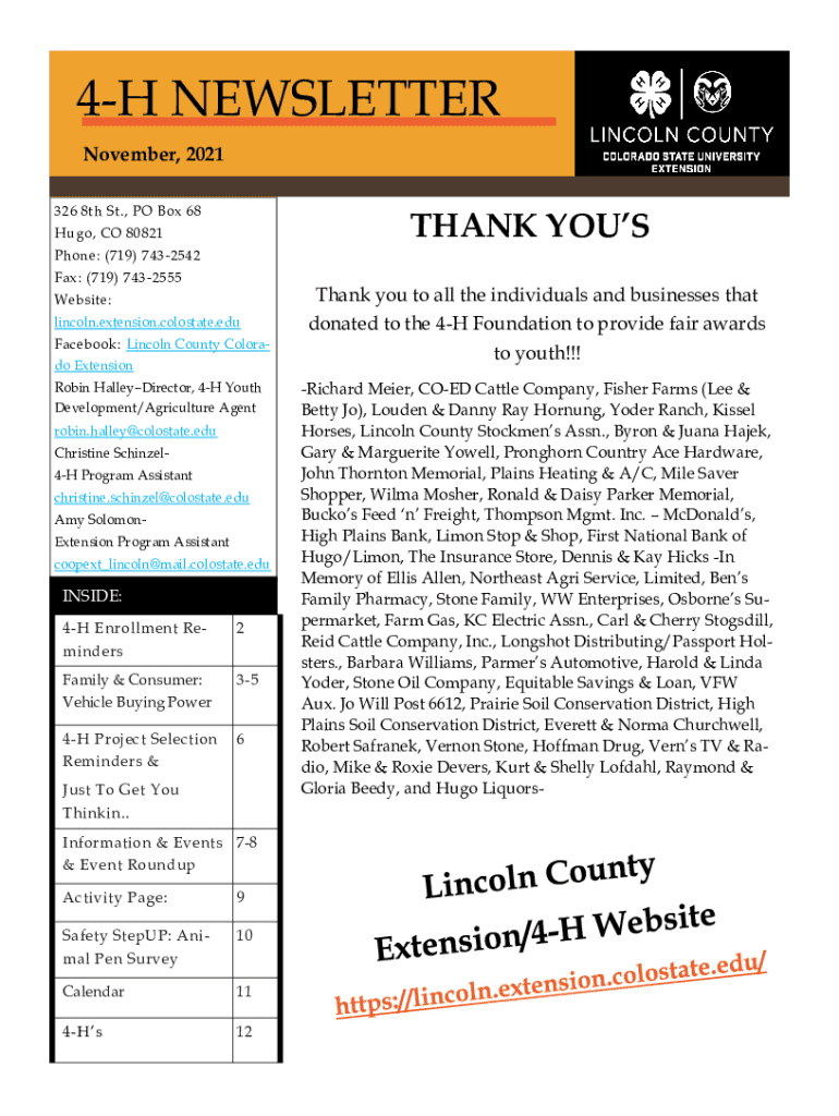 4H NEWSLETTER November 2021 326 8th St., PO Box 68THANK YOUS Hugo, CO 80821 Phone: (719) 7432542 Fax: (719) 7432555 Website: Lincoln.extension.colocate.edu Facebook: Lincoln County Colorado Extension