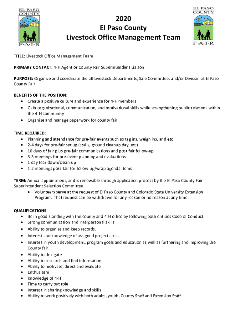 2020 El Paso County Livestock Office Management Team TITLE: Livestock Office Management Team PRIMARY CONTACT: 4H Agent or County Fair Superintendent Liaison PURPOSE: Organize and coordinate the all