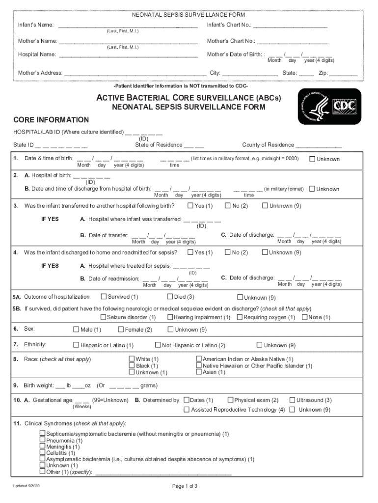 Get the free Neonatal Sepsis Surveillance Form-Active Bacterial Core Surveillance (ABCs)