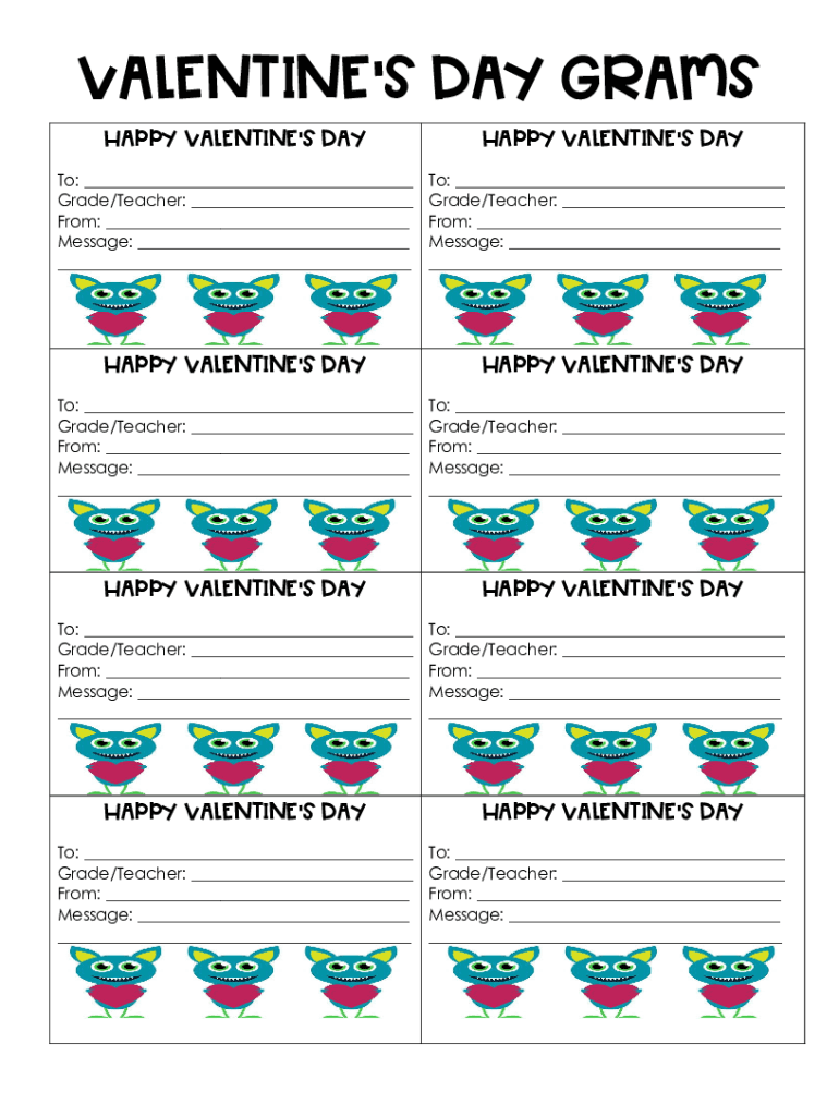VALENTINES Day GRAMS HAPPY VALENTINES Day To: ___ Grade/Teacher: ___ From: ___ Message: ___ ___HAPPY VALENTINES Day To: ___ Grade/Teacher: ___ From: ___ Message: ___ ___HAPPY VALENTINES Day To: ___