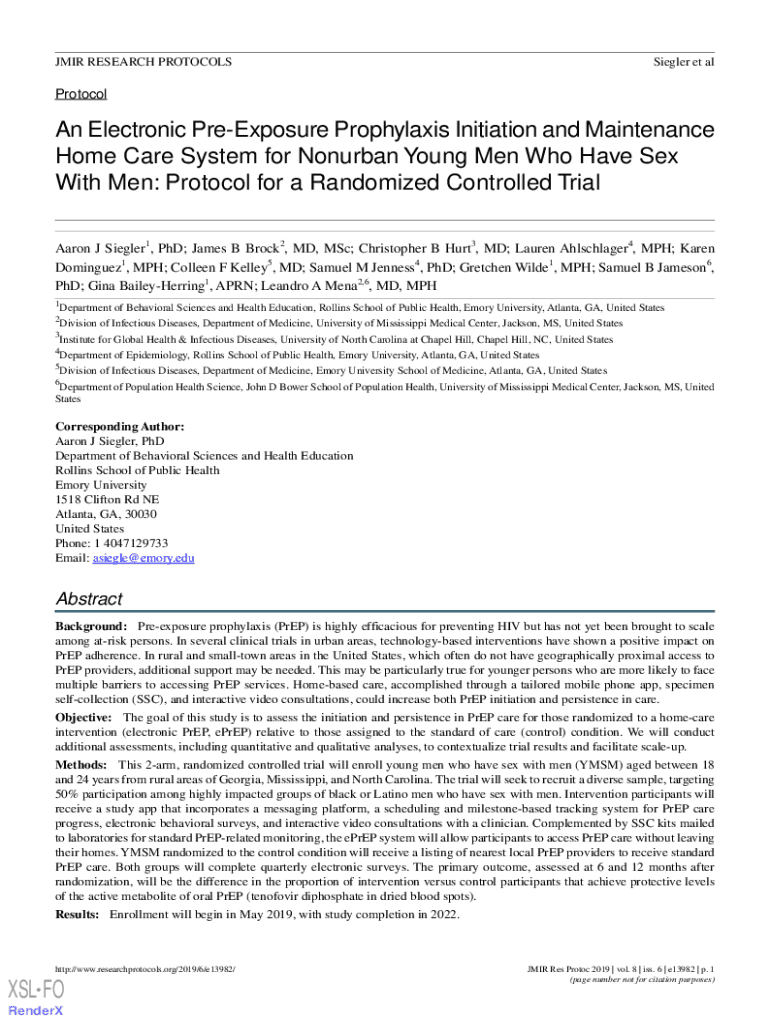 MIR RESEARCH PROTOCOLSSiegler et alProtocolAn Electronic Exposure Prophylaxis Initiation and Maintenance Home Care System for Nonurban Young Men Who Have Sex With Men: Protocol for a Randomized Controlled