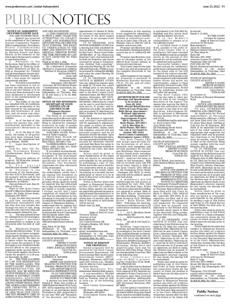 June 23, 2022 | 11www.jordannews.com | Jordan Independentpublicnotices NOTICE OF ASSESSMENT LIEN FORECLOSURE SALE YOU ARE NOTIFIED THAT, 1. Default has occurred in the conditions of the Common Interest