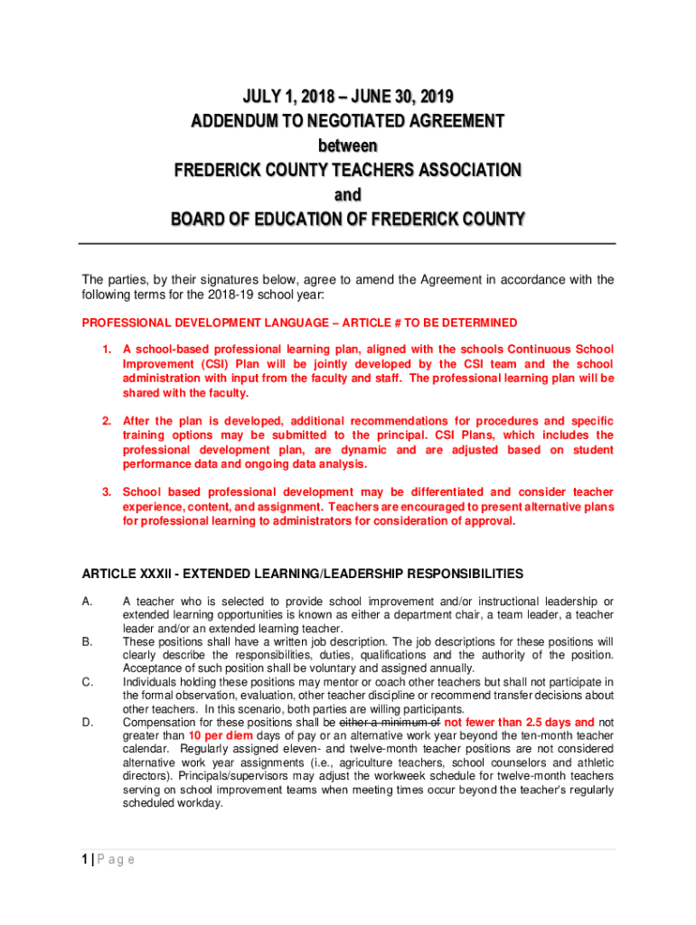 JULY 1, 2018, JUNE 30, 2019, ADDENDUM TO NEGOTIATED AGREEMENT between FREDERICK COUNTY TEACHERS ASSOCIATION and BOARD OF EDUCATION OF FREDERICK COUNTY The parties, by their signatures below, agree
