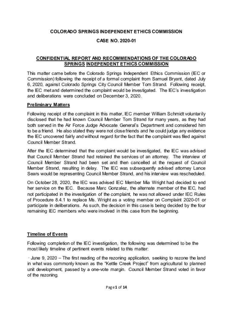 COLORADO SPRINGS INDEPENDENT ETHICS COMMISSION CASE NO. 202001 CONFIDENTIAL REPORT AND RECOMMENDATIONS OF THE COLORADO SPRINGS INDEPENDENT ETHICS COMMISSION This matter came before the Colorado Springs