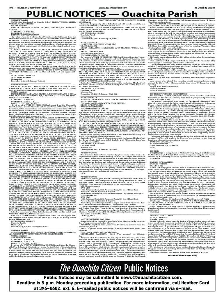 10B Thursday, December 9, 2021www.ouachitacitizen. Comte Wichita CitizenPUBLIC NOTICES Wichita ParishSHERIFFS SALE (Public Sale Conducted by Sheriff s Office) JAMEL VERGES, KIEL VERGES, ALLEN VERGES
