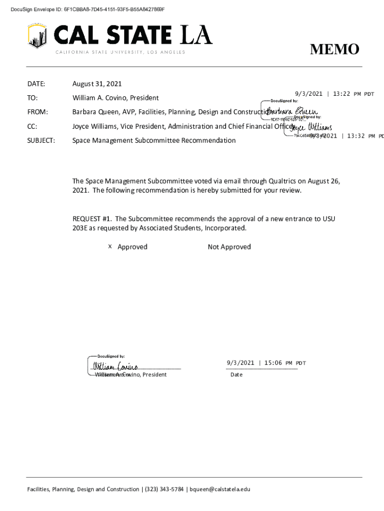 DocuSign Envelope ID: 6F1CBBA87D45415193F5B55A8427869FMEMO DATE:August 31, 2021TO:William A. Covino, PresidentFROM:Barbara Queen, AVP, Facilities, Planning, Design and Construction CC:Joyce Williams,