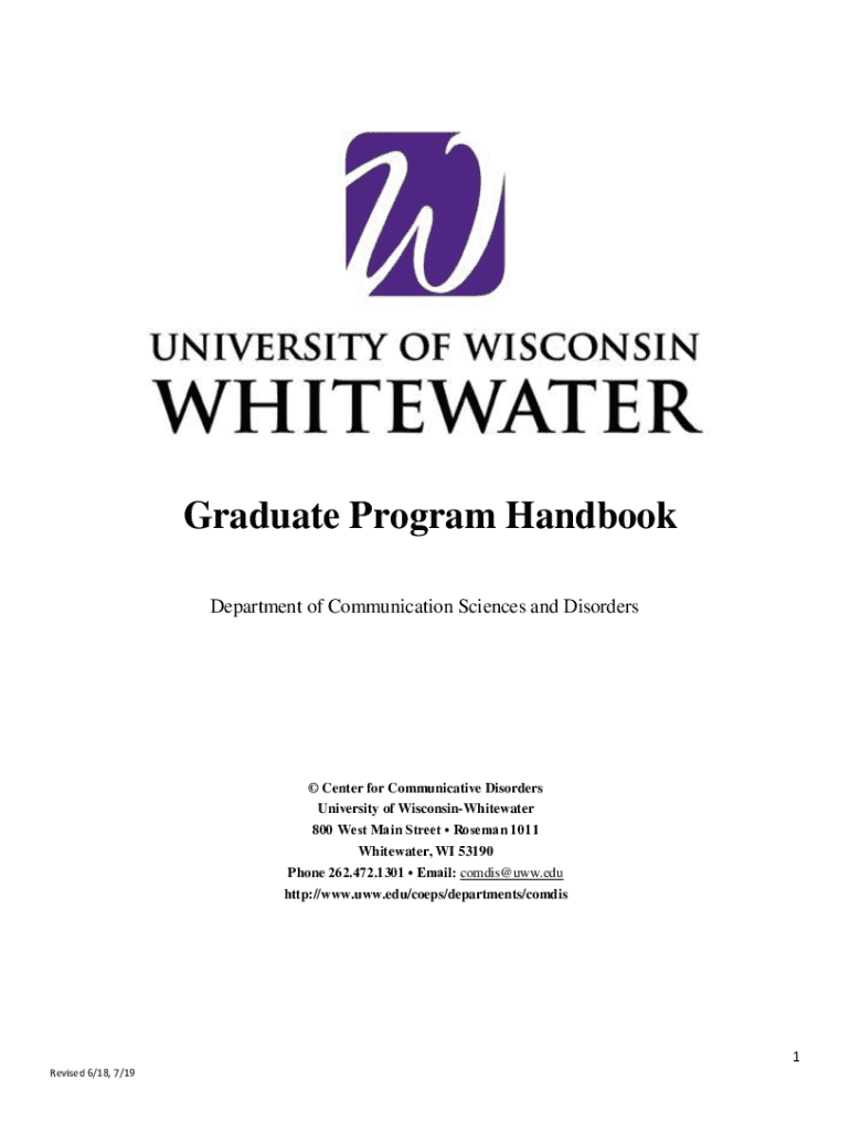 Graduate Program Handbook Department of Communication Sciences and Disorders Center for Communicative Disorders University of WisconsinWhitewater 800 West Main Street Rose man 1011 Whitewater, WI