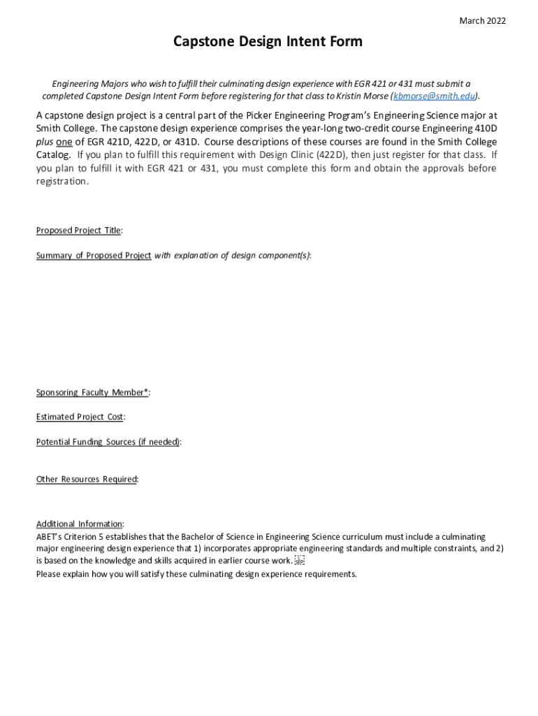 March 2022Capstone Design Intent Form Engineering Majors who wish to fulfill their culminating design experience with EAR 421 or 431 must submit a completed Capstone Design Intent Form before registering