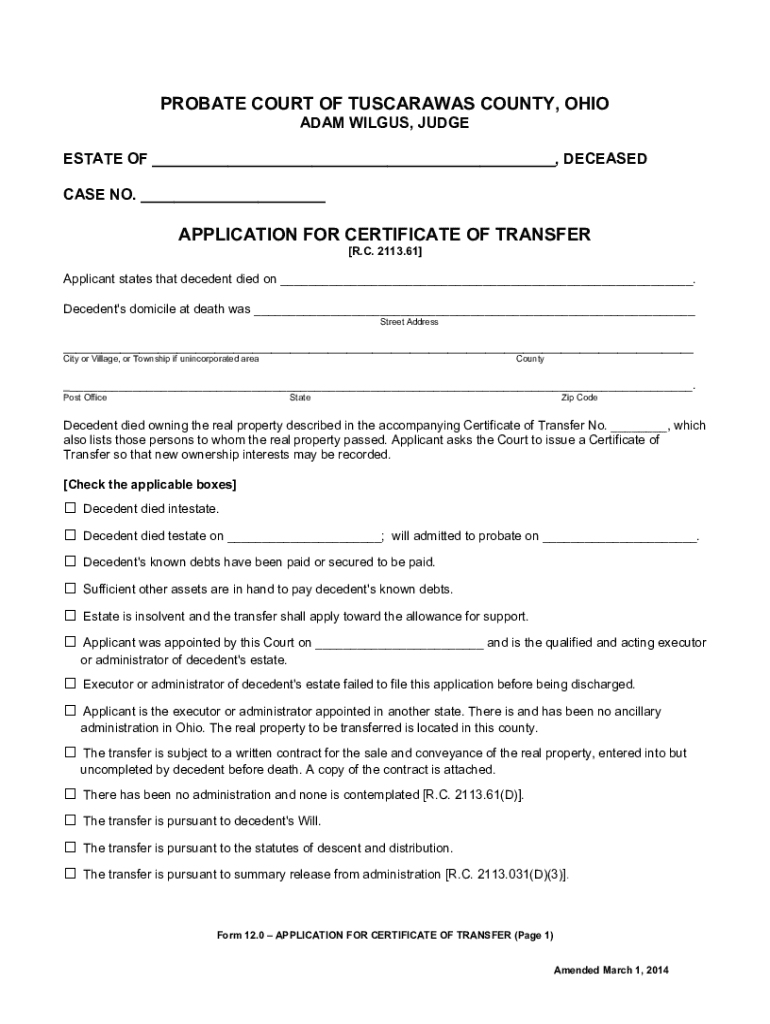 PROBATE COURT OF TUSCARORAS COUNTY, OHIO ADAM WINGS, JUDGEESTATE OF ___, DECEASED CASE NO. ___APPLICATION FOR CERTIFICATE OF TRANSFER [R.C. 2113.61]Applicant states that decedent died on ___. Decedent\'s