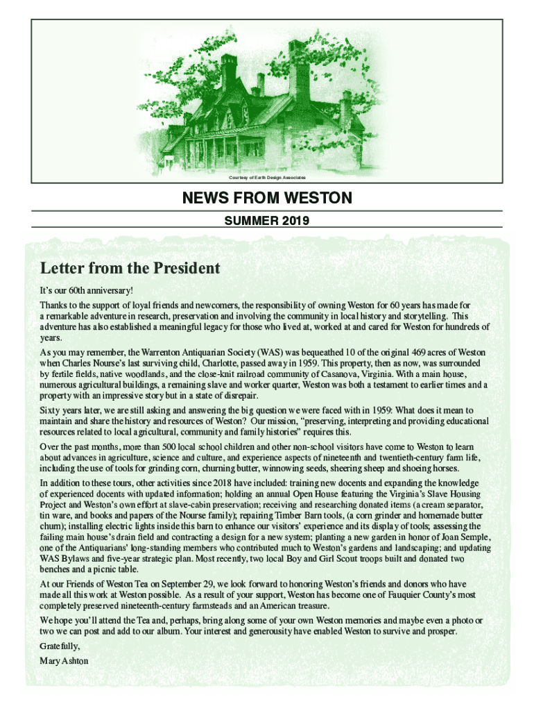 Courtesy of Earth Design AssociatesNEWS FROM WESTON SUMMER 2019Letter from the President It's our 60th anniversary! Thanks to the support of loyal friends and newcomers, the responsibility of owning