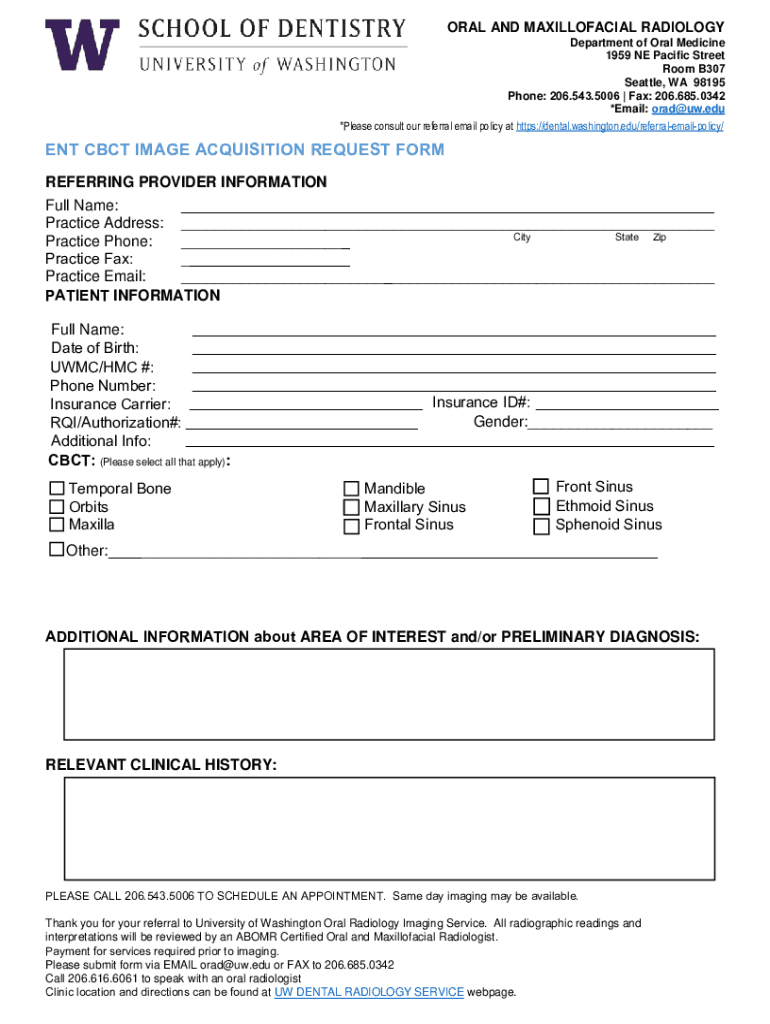 Get the free ENT CBCT IMAGE ACQUISITION REQUEST FORM - UW School of Dentistry - dental washington