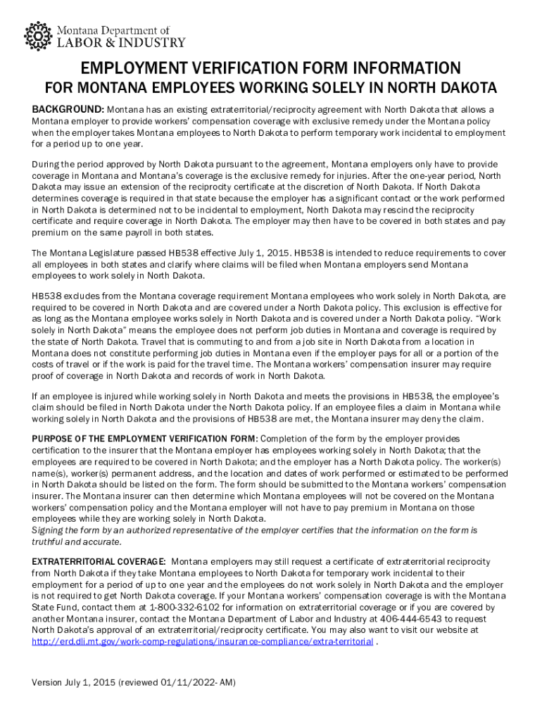 EMPLOYMENT VERIFICATION FORM INFORMATION MONTANA EMPLOYEES WORKING SOLELY IN NORTH DAKOTA BACKGROUND: Montana has an existing extraterritorial/reciprocity agreement with North Dakota that allows a