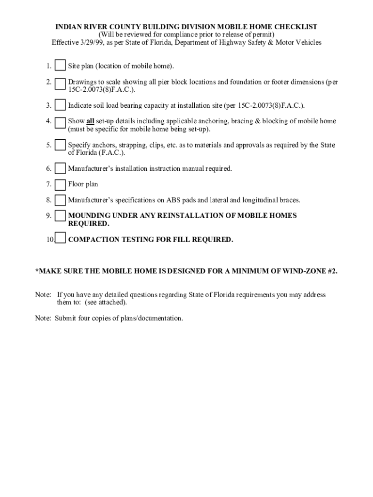 INDIAN RIVER COUNTY/CITY OF VERO BEACH BUILDING DIVISION 1801 27th Street, Vero Beach, FL 32960772 2261260Mobile Home Placement Guidelines All Mobile Home permits (replacement or new) must provide