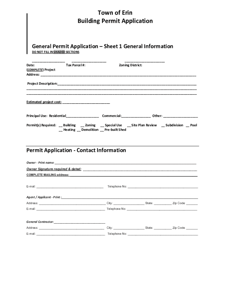 Town of Erin Building Permit ApplicationGeneral Permit Application Sheet 1 General Information DO NOT FILL IN SHADED SECTIONS___ ___ ___ Date: Tax Parcel #: Zoning District: (COMPLETE) Project Address: