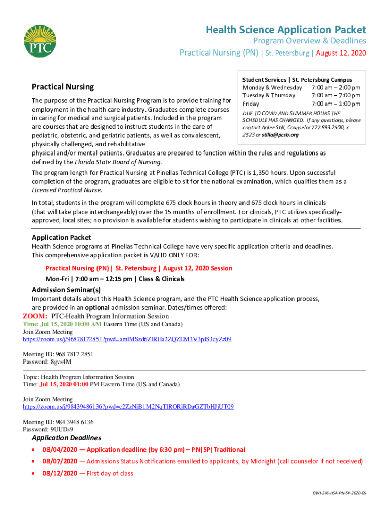 Health Science Application Packet Program Overview & Deadlines Practical Nursing (IN) | St. Petersburg | August 12, 2020Practical NursingStudent Services | St. Petersburg Campus Monday & Wednesday