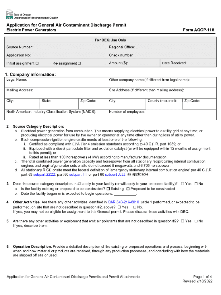 PrintSaveApplication for General Air Contaminant Discharge Permit Electric Power GeneratorsForm AQGP118For DEQ Use Only Source Number:Regional Office:Application No:Check number:Initial assignment
