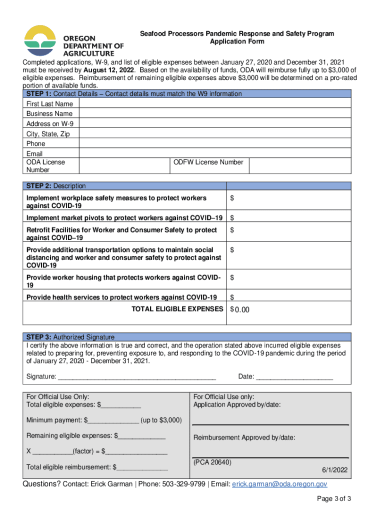 Seafood Processors Pandemic Response and Safety Program Application Instructions The U.S. Department of Agriculture (USDA) working with the Oregon Department of Agriculture has provided an investment