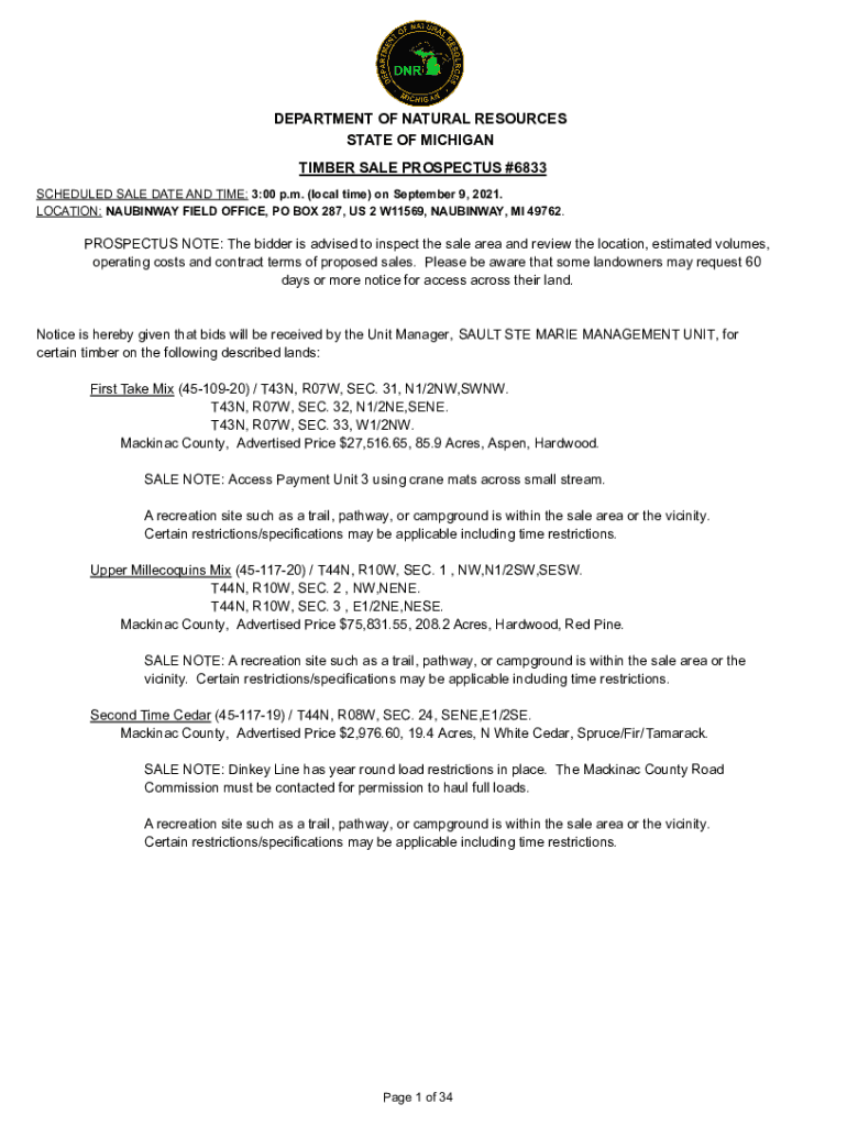 DEPARTMENT OF NATURAL RESOURCES STATE OF MICHIGAN TIMBER SALE PROSPECTUS #6833 SCHEDULED SALE DATE AND TIME: 3:00 p.m. (local time) on September 9, 2021. LOCATION: NAUBINWAY FIELD OFFICE, PO BOX 287,