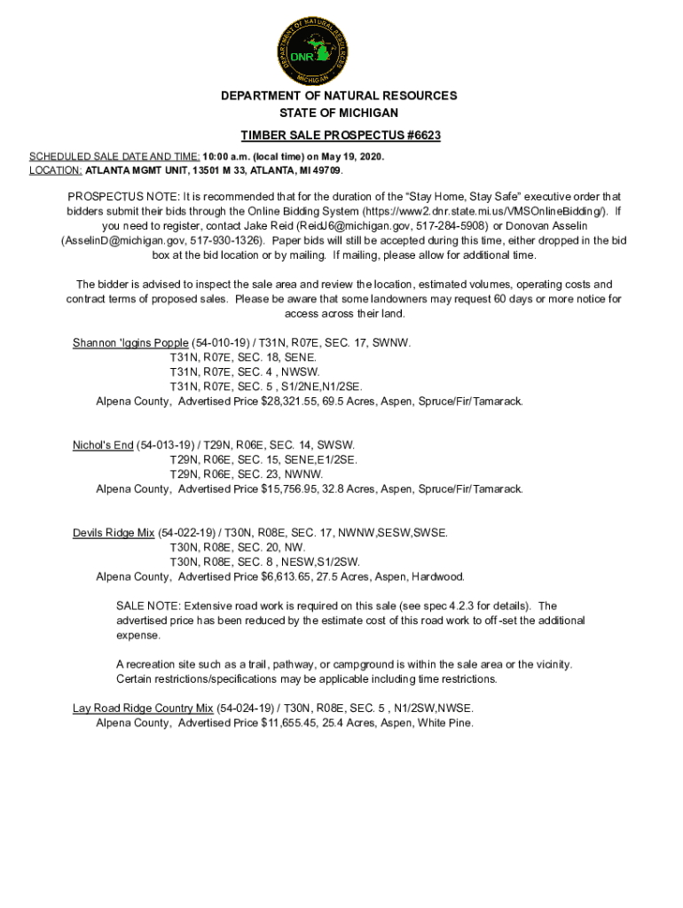 DEPARTMENT OF NATURAL RESOURCES STATE OF MICHIGAN TIMBER SALE PROSPECTUS #6623 SCHEDULED SALE DATE AND TIME: 10:00 a.m. (local time) on May 19, 2020. LOCATION: ATLANTA MGMT UNIT, 13501 M 33, ATLANTA,