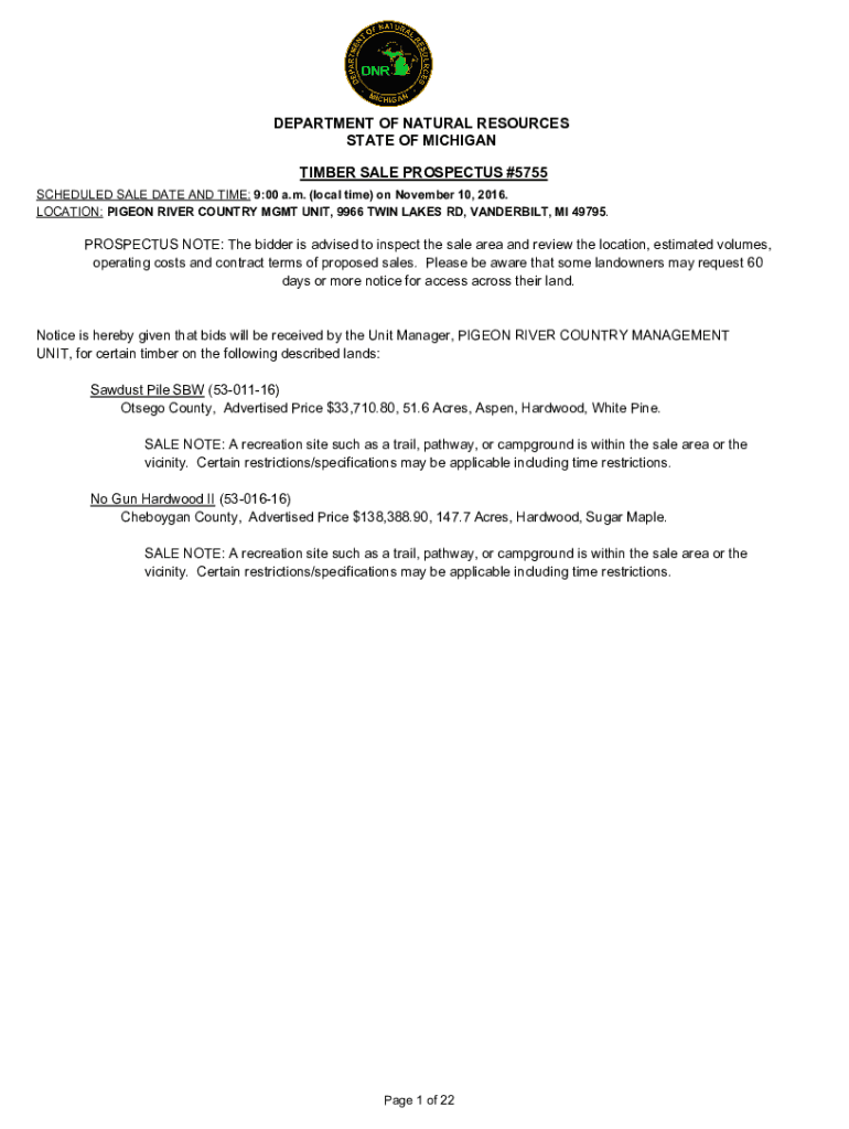 DEPARTMENT OF NATURAL RESOURCES STATE OF MICHIGAN TIMBER SALE PROSPECTUS #5755 SCHEDULED SALE DATE AND TIME: 9:00 a.m. (local time) on November 10, 2016. LOCATION: PIGEON RIVER COUNTRY MGMT UNIT,