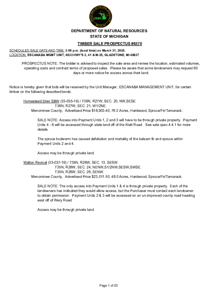 DEPARTMENT OF NATURAL RESOURCES STATE OF MICHIGAN TIMBER SALE PROSPECTUS #6570 SCHEDULED SALE DATE AND TIME: 3:00 p.m. (local time) on March 31, 2020. LOCATION: CANADA MGMT UNIT, 6833 HWY\'S 2, 41