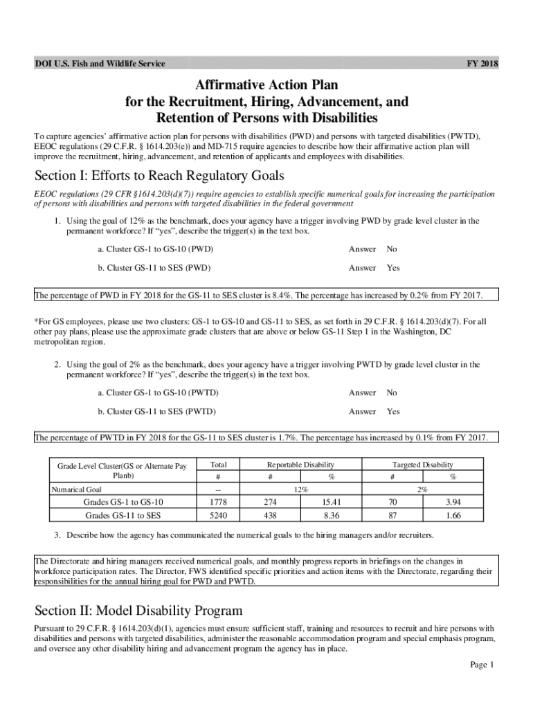 DOI U.S. Fish and Wildlife Service FY 2018Affirmative Action Plan for the Recruitment, Hiring, Advancement, and Retention of Persons with Disabilities To capture agencies affirmative action plan for